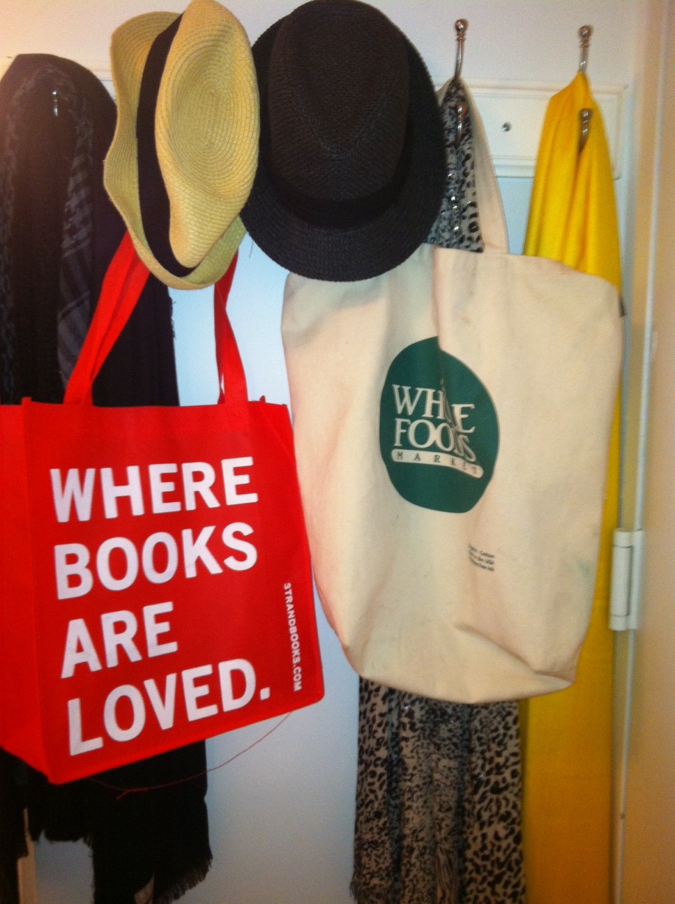 [Finally, finishing touches hang on hooks in the foyer hallway for easy access on my way out the door. All Totes, Scarves, Hats: NYC street vendors/free from retailers]
