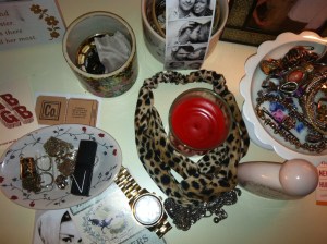 [Accessories live on the bedside table, along with photobooth snapshots, business cards & matches from favorite restaurants, assorted bowls and stands from flea markets, and my go to lipstick, NARS ‘Manhunt‘]