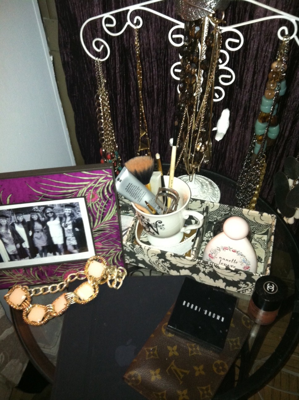 [A glass end table holds favorite baubles, makeup brushes, and daily essentials: my iPad, Bobbi Brown bronzer, Nanette Lepore perfume, and a picture of my best friends on our graduation day]