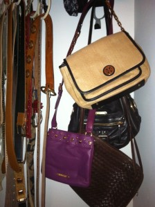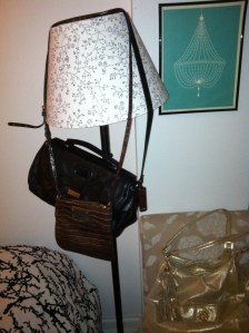[More bags hang from a lamp and rest on an accent chair. Bags: Marc by Marc Jacobs, Botkier, Tory Burch. Lamp: Ikea. Chair: Overstock.com (such a steal!)]