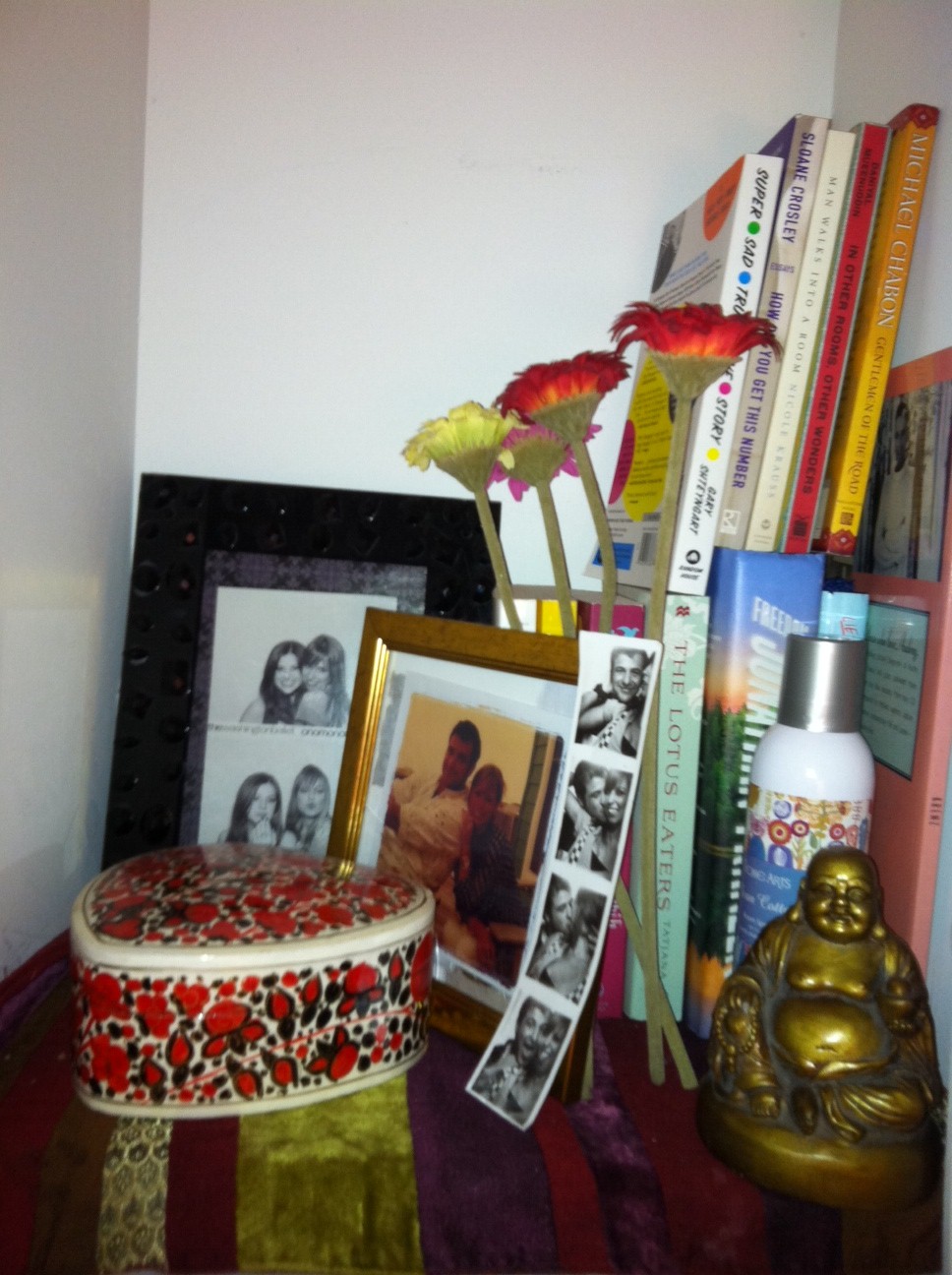 [Making use of every nook and cranny: a random built-in shelf displays my recent book purchases (currently: Super Sad True Love Story by Gary Shteyngart, How Did You Get This Number by Sloane Crosley, Freedom by Jonathan Franzen), framed pictures of my boyfriend and friends, a heart-shaped box for spare buttons and lighters, a Buddha I’ve had since freshman year of college, and my favorite spray for freshening up a room: Crabtree & Evelyn Rosewater]
