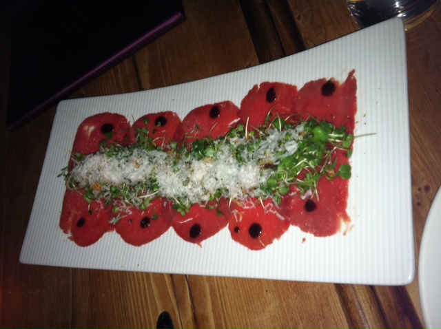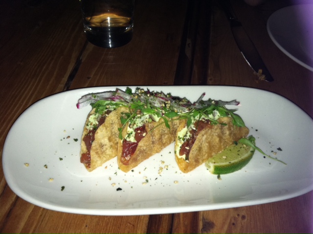 [Tuna Poke Wonton Tacos. I loved these, the tuna was so fresh and the wasabi perfect. Also, note how each picture gets more blurry and off-center with the consumption of mas vino]