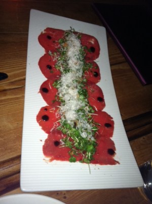 [Kobe Beef Carpaccio–with shallot crisps, arugula, and black olive oil]