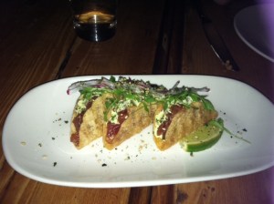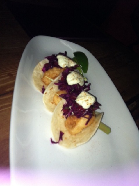 [Lobster Tacos–beer battered Maine lobster with cabbage slaw & jalapeno cream. Weird angle and flash a result of my enthusiastically grabbing for the largest taco while trying to snap a picture before all tacos were devoured]