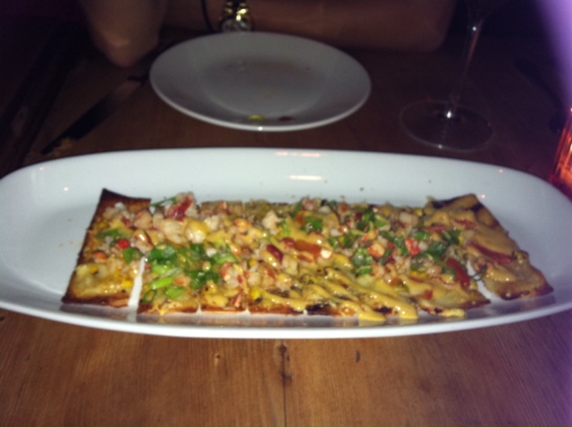 [Lobster Pizzetta–with roasted corn, avocado-chili puree, crispy bacon, and of course, lobster. My favorite dish of the evening, even without the bacon]