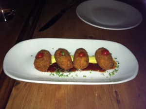 [Crispy Chicken Croquettes with curried yogurt, chili caramel, piquillo]