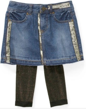 [My favorite outfit, 2003-2005. Does it get any better than this? Sparkly miniskirt with glittery leggings? Ah-mazing. Image c/o The Gloss. Both these items are actually Mary Kate & Ashley for Walmart…a long way from The Row and Elizabeth and James, don’t ya think?]