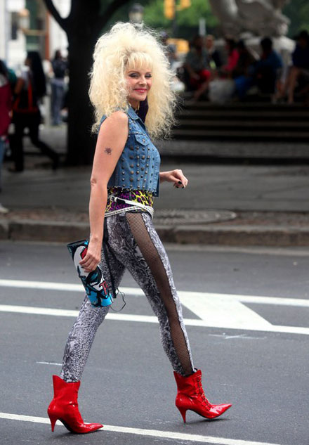 [Kim Catrall in leggings-as-pants, 80’s style. Woman is FIERCE. Image c/o PopCrunch]