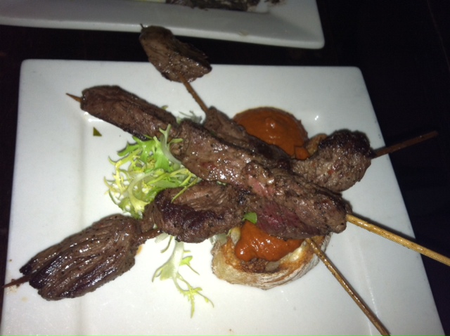 [Steak skewers with paprika & coriander marinade came after. The steak was perfectly grilled, and the sauce delightfully spicy]