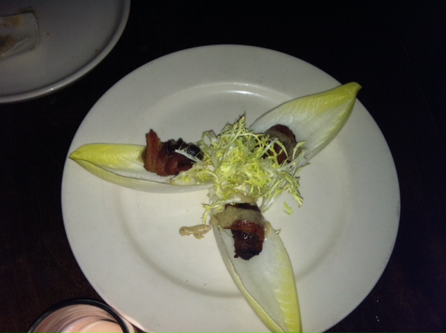 [We started with almond-stuffed, bacon-wrapped, piggy-back dates. I could and would gladly eat about 25 of these in a sitting]