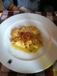 [Pumpkin ravioli for lunch at Luch’s Restaurant. This was probably the most well deserved meal I have ever eaten, consumed after arriving at our hostel at 2AM, having a “dinner” of corn flakes and Jager, and going out dancing with hostel staff until klub klosing hours]