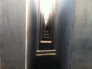 [The Holocaust Memorial in the city center. On Saturday morning, we did a four hour walking tour of the city with New Berlin Tours. This was by far my favorite part of the trip–our tour guide was ridiculously smart and captivating, and I learned so much from him. (It helped that he was British and had adorable British swoopy hair and a scintillating British chuckle). The tour took us all around Berlin, but the eerily beautiful Holocaust memorial was one of my favorite stops–it consists of a football field of stone slabs ranging in height from 6 inches to 20 feet, and one feels unsettlingly lost trying to navigate it]