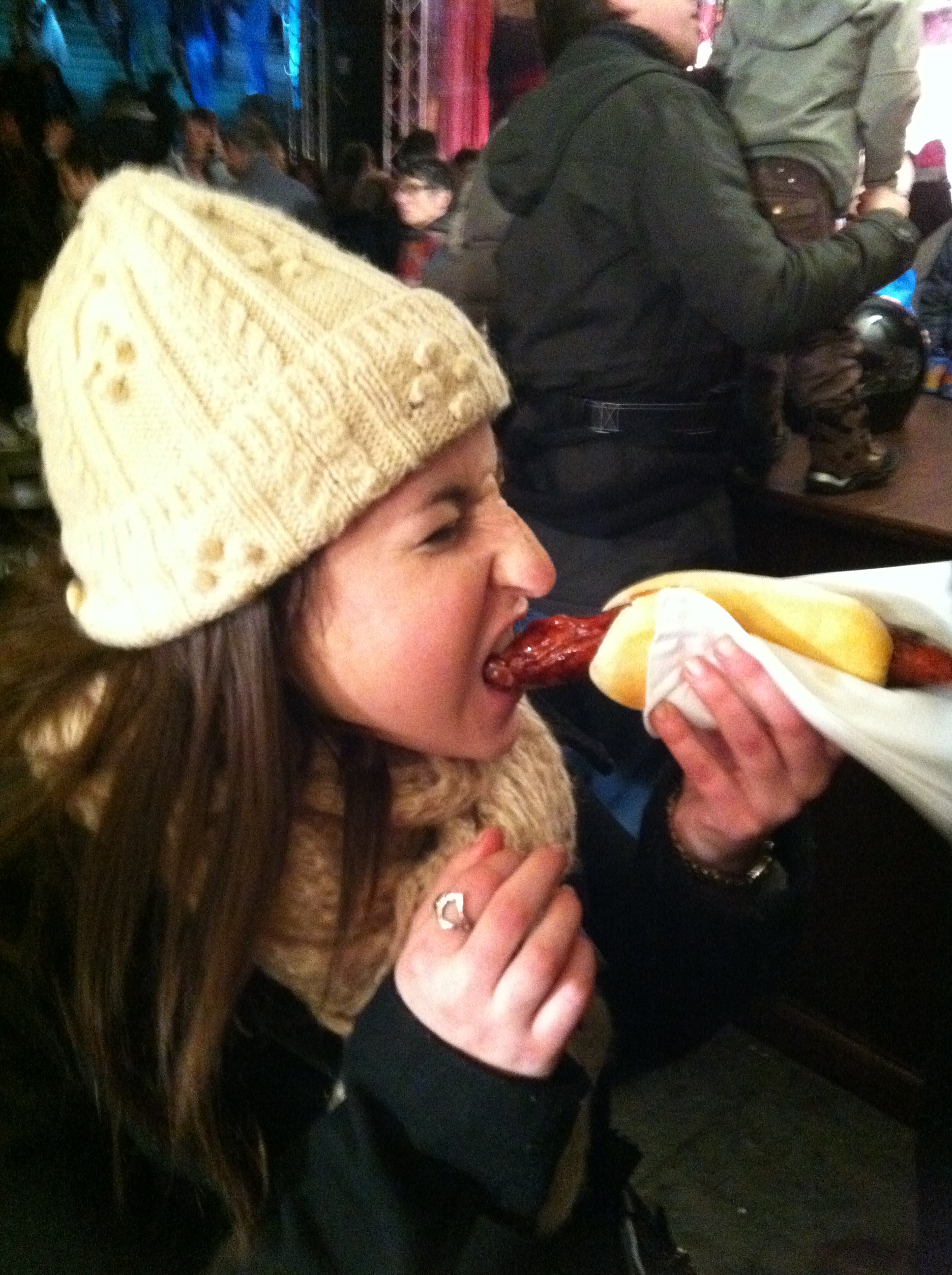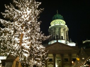 [View from the Christmas Market! Last Saturday was the first day of Christmas season, which, in Germany, means small enclosed markets full of every type of accessory and culinary treat one can desire, and vendors selling glugwein (hot mulled wine with cinnamon), cheesy pretzels, and spicy sausage, while the score from The Nutcracker plays plays from a live band. Needless to say, this was heavenly]