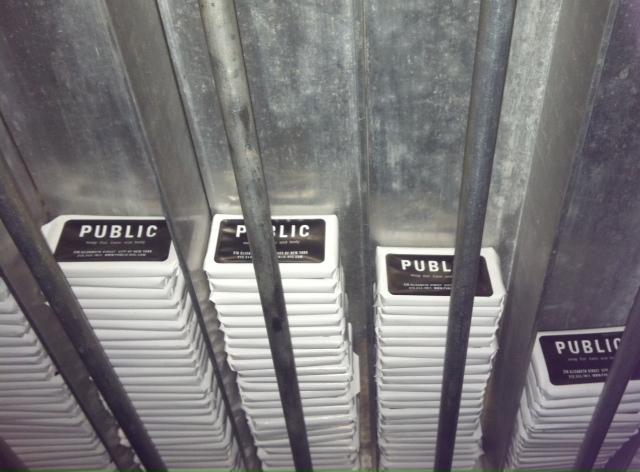 As usual, we found ourselves too full for dessert but lingered for some post-dinner cocktails and to eavesdrop on the beautiful people around us. Our total bill came in at about $30 less than our last fancy dinner out (at Scarpetta), and the food, service, and ambiance was considerably more pleasant. I would really like to come back to PUBLIC for brunch, which I hear is phenomenal, or Sunday Supper accompanied by cocktails at The Monday Room. The Nolita location is perfect as well–after our gluttonous meal, we walked along the Bowery pausing to make note of places we’d like to try when we are not stuffed to the brim with meats and spirits, and, since it was a particularly pleasant night, walked all the way back home (I would like to think that walk burned at least 1/10th of the calories we consumed, but I really can’t be sure).