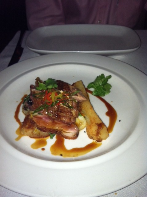 [We finished with the pan-roasted duck breast with sesame soy dressing, cassava chips, wokked bok choy and pickled onions. This was definitely my favorite course, and ducks aren’t adorable so I felt absolutely no rue. The duck breast was ridiculously soft and juicy, and the Asian-inspired sides added wonderfully to the flavor]