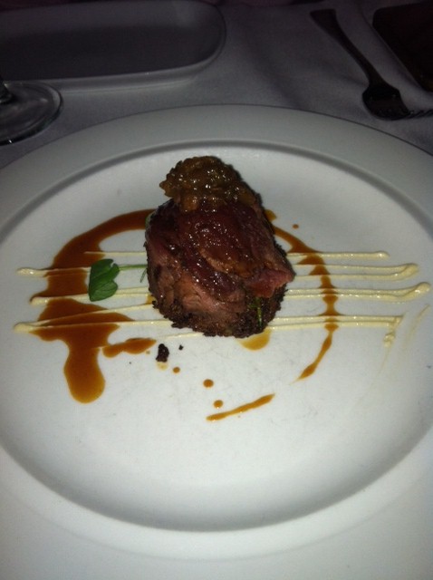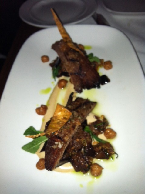 [Our second course was grilled Kobe beef tongue with an aubergine-cumin relish and a pita bread puree. The Kobe beef was flavorful, but a bit tough. The relish was excellent]