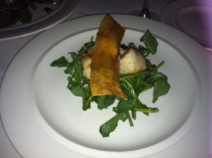 [We started with grilled scallops with sweet chili sauce, crème fraiche and green plantain crisps. The scallops were perfect in texture (I love scallops, but their texture is seriously difficult to pin down. They either melt in your mouth or taste grossly scratchy), and the plantain crisps added an unexpected kick]
