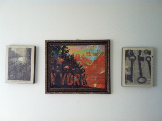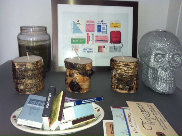 [Inspired by spending prolonged periods of time in actual homes rather than twenty-something disheveled apartments, I added a few fun art pieces, a new bench, and some much-needed accents to our little place. Above: Can you believe the frame and newspaper-print images now hanging in our living room are from TJ Maxx? I scooped them up at the Chelsea location–a hot, disorganized mess, but brimming with awesome pieces if you have a little time and a lotta patience. I snagged a bunch of little things for the home, the aforementioned bench at a 65% discount, and an Alice+Olivia fur vest for under $500 total!) The sweet New York poster (hand-painted onto a subway map) was bought on the street in the West Village. Below: Some Z Gallerie Candles, a sparkly skull (via Home Goods, my favorite stop for apartment goodies. I haven’t been to the new Upper West Side location but adore the one by my parents’ house in Dirty Jerz), one of my favorite Pinterest prints framed, and our growing collection of pretty matches from yummy eateries…make for a cozy nook)]