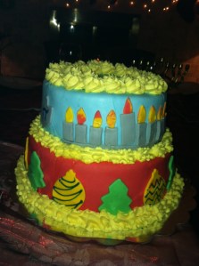 [Multi-denominational holiday cake. You guys–my sister baked this from scratch and decorated it by hand. She is a goddess with a KitchenAid. It really puts me to shame. I had about three slices, of each layer–one was red velvet with cream cheese frosting and the other was vanilla with homemade raspberry whipped cream. Thanks for the 5 pounds, sis. But fo reals, isn’t she amaze? Her and her baking partner in crime started this little blog, Baking Buddiez, this summer. They have unfortunately been terrible with updating the world with their culinary treats but the girls are seriously talented (at expanding my waistline). Check it]