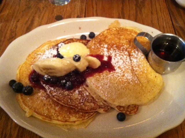 [The lemon cornmeal pancakes, served with bananas, blueberries, powdered sugar & maple syrup, were our favorite out of our dishes. As our waiter promised, they were not “too lemony,” and rather, fluffy, sweet, and delicious, with just a hit of tang]