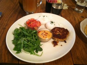 [The baked crab cake with poached eggs, chow chow relish & old bay aioli was a close second. The crab cake was perfect–it melted in our mouthes without feeling unhealthy (although, duh, it was), and the eggs were ideally poached– though we felt they could have used some sort of sauce or relish]