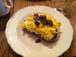 [The mushroom toast–served with grilled potato bread, herb ricotta, wild mushrooms and scrambled eggs was kind of like the Spiderman musical--an amazing idea in theory, and I guess some people liked it, but lacking in execution. Bread, ricotta, and mushrooms are three of my favorite ingredients in all food’s land. This should have been perfect, but it wasn’t]