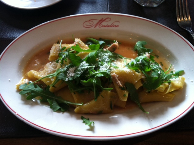 [Malfatti at Maialino‘s brunch–hand-made pasta with roast suckling pig and arugula is a bit of a strange choice for a brunch dish, but this really hit the spot. Remember when I used to be a vegetarian? I’ll consider it a two-year long lapse of judgement (although I must say, my pants miss being able to close. My move as of late when dining is either a) do the sensible thing and wear a loose dress, or b) pair pants with a long top as to be able to fully unbutton throughout meal)]