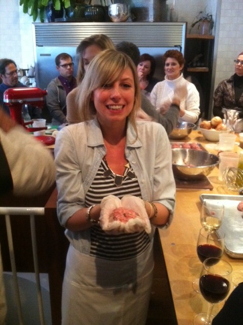 [Meatball-making class with The Little Owl’s Joey Campanaro! We spent Sunday pre-Superbowl rolling delicious balls, baking our own buns, hand-pulling pasta, and stuffing our bodies full of yummy Little Owl goodies. The class was great, and I’ll be posting closeups of veal-pork-beef perfection and Joey making sweet love to a Kitchen Aid mixer later this week. For now, please note me holding my meatball the way a normal person might hold an injured baby bird]