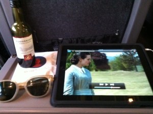 [My favorite mode of transit–Amtrak, complete with personal vino bottles and Downton Abbey on myPad]