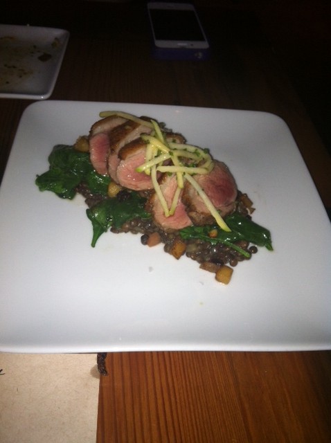[Dinner at Estadio, one of our favorite restaurants: Crispy Duck Breast, Beluga Lentils, Catalan Greens]