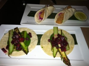 [Mahi Mahi and Charred Asparagus Tacos, paired with a ‘City of Gold’–tequila, St. Germaine, and lemon–tangy perfection. The Mahi Mahi tacos were my favorite thing on the menu by far]