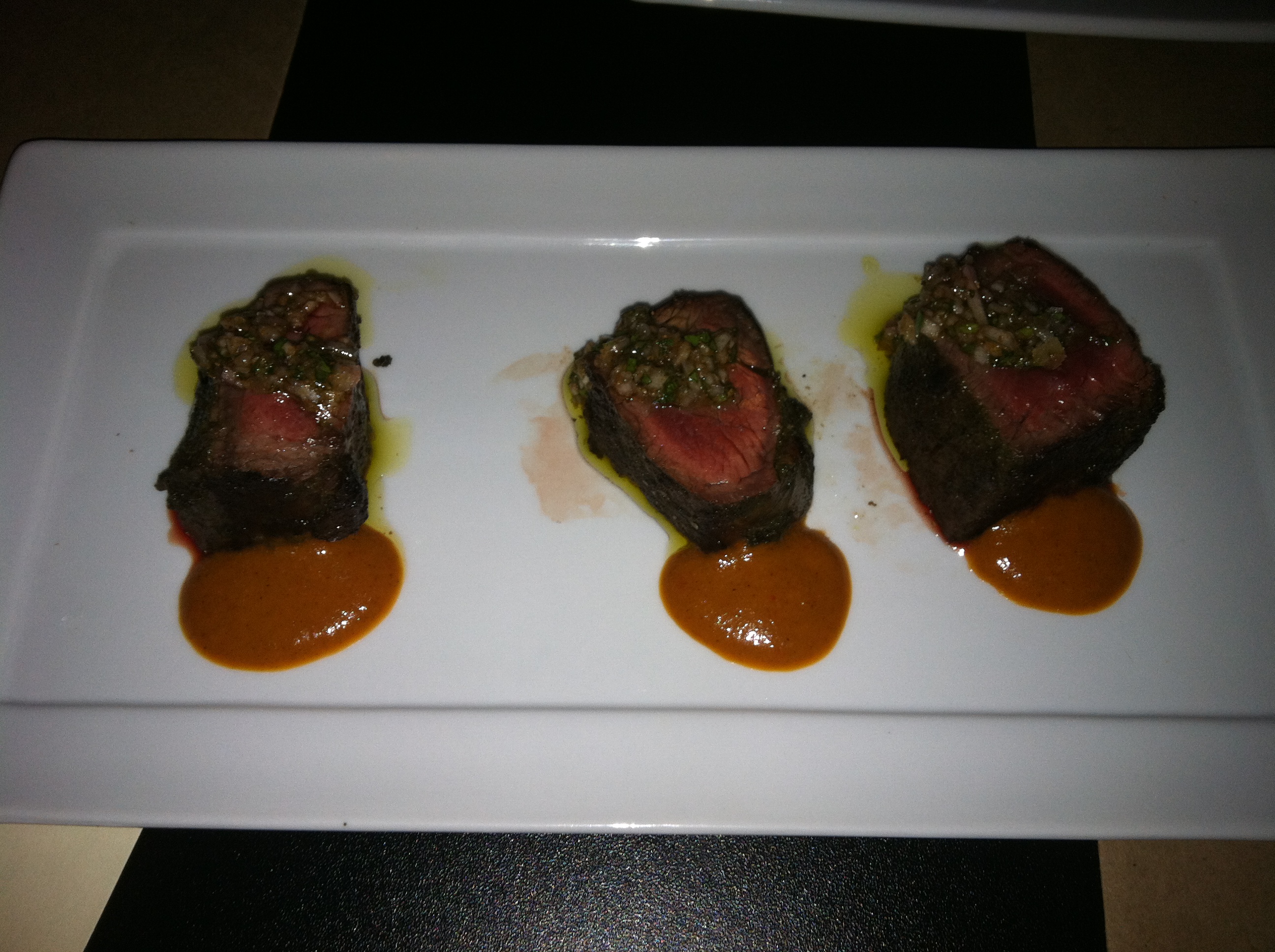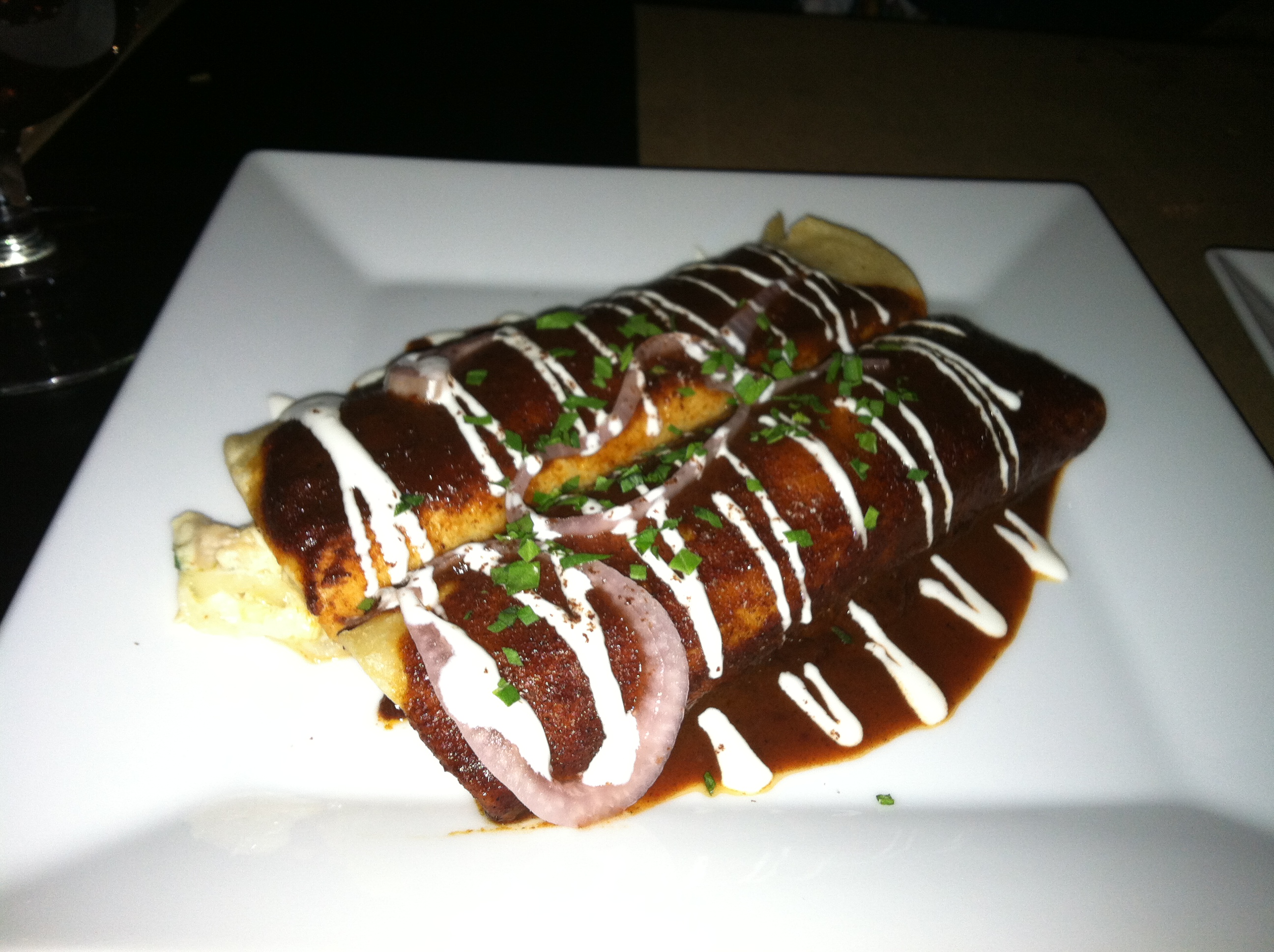 [Chicken, cascabel and CHOCOLATE enchiladas. Apparently drizzling entrees in chocolate makes them perfect. One should have guessed]