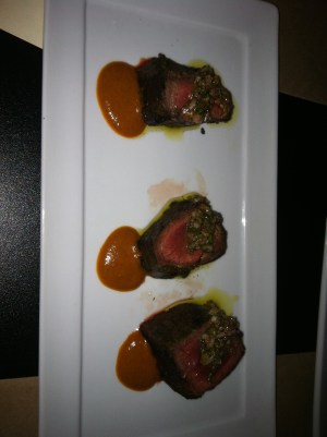 [Hanger Steak with Chimichurri, paired with Malverde–a cool, refreshing drink made with mezcal, agave, cucumber, cilantro and bitters]