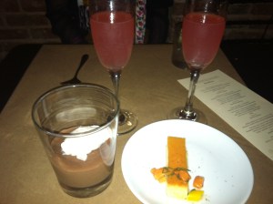 [Dessert–flan and Mexican chocolate pudding, served with Prickly Pear Sparkling Wine. This spread looks a bit like a honeymoon dinner, which it in fact, was.]