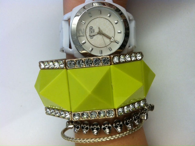 [Springtime arm party: Coach boyfriend watch (gift from the manz), Forever 21 neon bangle, vintage skull bracelet, thin gold bangle (gift from the manz momz)]