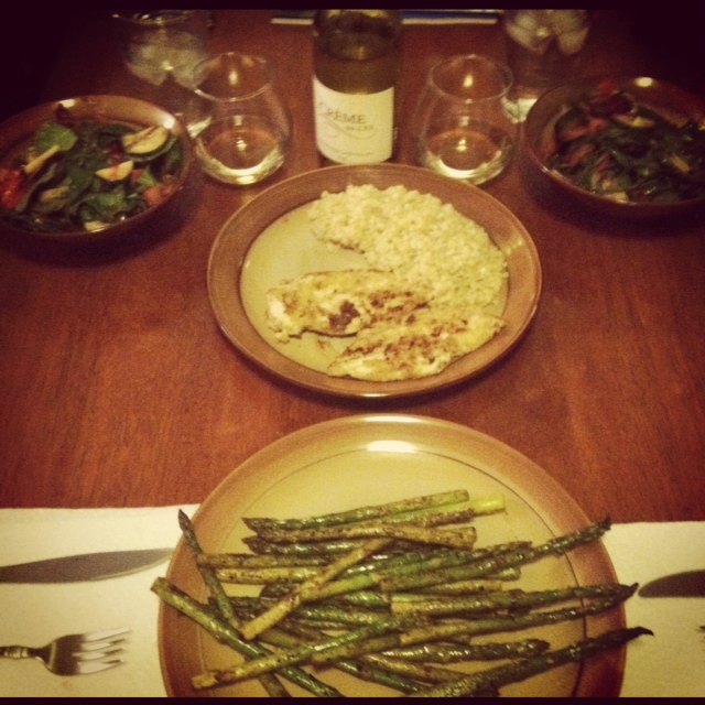[Ever since the weather has gotten nice enough to grocery shop rather than order all our non-going-out meals on Seamless Web, the boyfriend and I have been popping into the Food Emporium on his corner (or, when we are not lazy, the Trader Joe’s fifteen blocks away) to make easy weeknight meals. Here, prepared by yours truly without causing any considerable damage to the kitchen: roasted asparagus, breaded chicken breasts, mushroom risotto and fresh salad. Served with wine, of course]