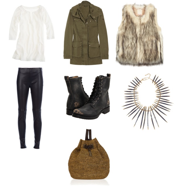[Tunic: J.Crew, Leather Leggings: Balenciaga (hello, Arena Couture), Military Jacket (For Warmth and General Badassery): Belstaff, Fur Vest: Rebecca Taylor (on sale! I may need this more than Katniss), Combat Boots: Frye, Necklace That Doubles As Weapon To Poke Cato’s Eyes With: Aurélie Bidermann Via Net-A-Porter (Other things I need more than Katniss), Backpack: Michael Kors (I was going to give her a clutch but decided to be practical at the last minute)]