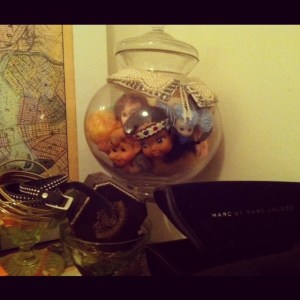 [Cool/mass-murder-esque collection of dismembered doll’s heads at my friend’s awesome apartment. (Hi, A!) I always appreciate a good collection. My last collection was of turtles, and it happened sort of organically. I had 4 or 5 and then people assumed I collected them and began purchasing them as gifts whenever they went on trips or for little occasions. The turtles followed me to college and now live in the shrine to my 16 year old self my room in my parents’ house. I suppose one can’t grow a dismembered doll’s head collection in the same manner, but these are still excellent ]