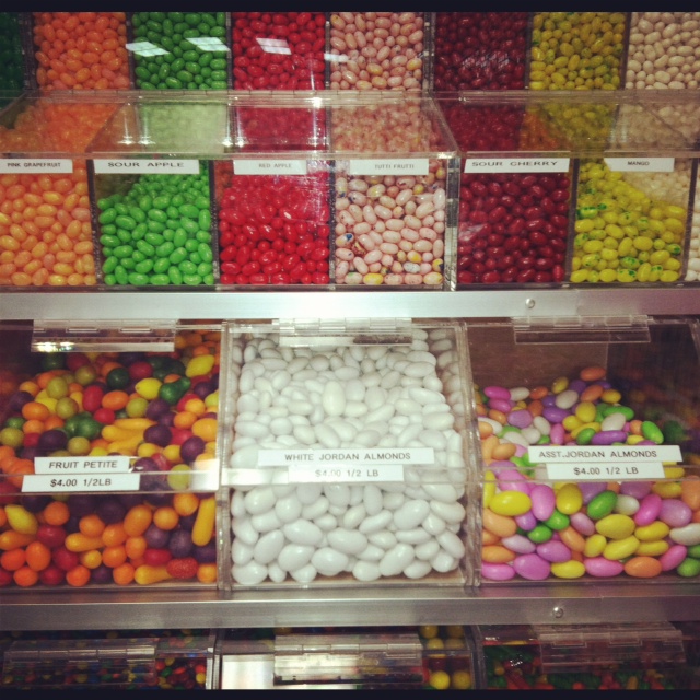 [Rainbow Bright. Something about candy shops always makes me think of spring and summer and happiness. Perhaps that is why I can’t exit one without at least one small bag of multi-colored sweets. Fun Fact for city dwellers–Tasti DLite: awful frozen yogurt, incredible candy selection]