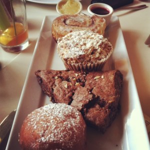 [The middle of said brunch. Casual pastry platter of coffee crumb cake, white chocolate cherry scones, pecan sticky buns and lemon poppyseed muffin with maple butter and raspberry sauce]