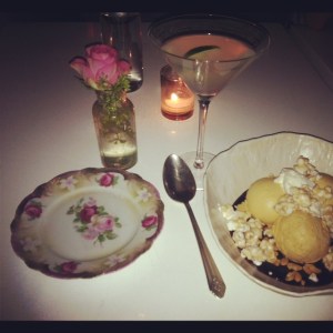 [Drinks and Dessert at ABC Kitchen. Can I just live at ABC Kitchen? I suppose that’s the point of furnishing the restaurant with decor from the store. Beautiful table setting for a beautiful experience. The dessert was one of the best I ever had and consisted of a sundae of salted caramel ice cream, candied peanuts & popcorn, whipped cream & chocolate sauce]