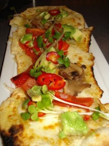 [Wild Mushroom Flatbread with oaxaca, red pepper, and avocado for dinner at Masa 14]