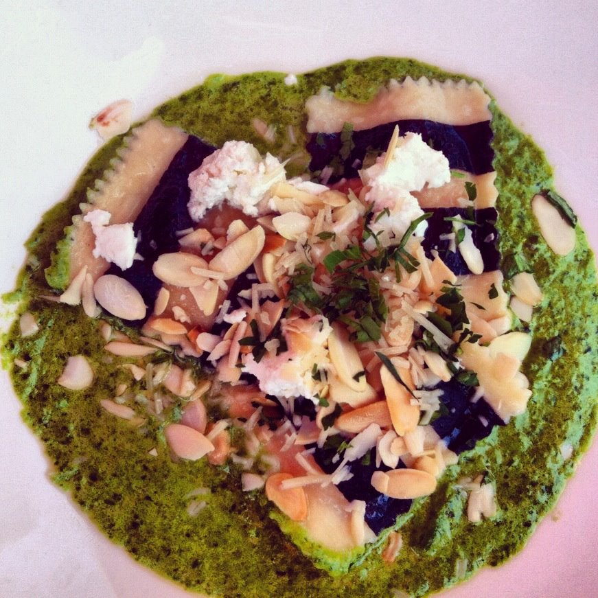 [Maine Lobster Ravioli topped with crumbled goat cheese, herbs and toasted almonds in a tarragon cream sauce for brunch at old neighborhood brunch fave, Circa]