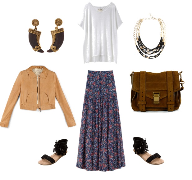 [Earrings: House of Harlow, T Shirt: Rag & Bone, Necklace: BGBG, Jacket: J Brand, Skirt: Paul & Joe, Bag: Proenza Schouler, Sandals: Minnetonka]