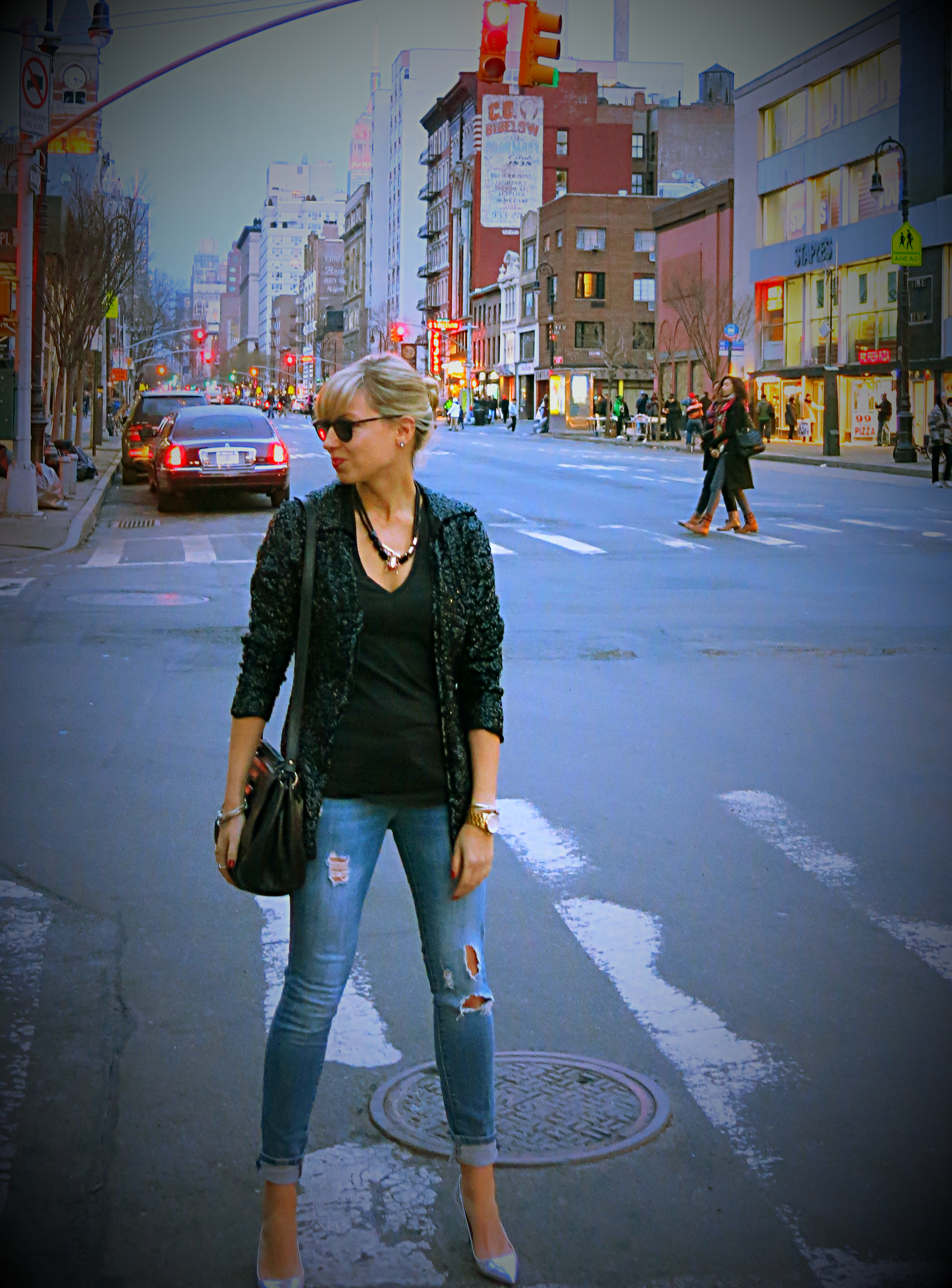 An unseasonably warm Sunday called for a getup featuring a few of my favorite vintage finds, and a photo shoot stopping traffic on Sixth Avenue. Because there’s nothing that screams “The polar vortex is over!” like getting hit by the Sex & The City tour bus. There’s also nothing that screams “Superbowl Sunday” like a sequin jacket & metallic pumps, but in the interest of maintaining friendships, I did change into a slightly more casual (read: forgiving in the waistline) outfit for the big game.