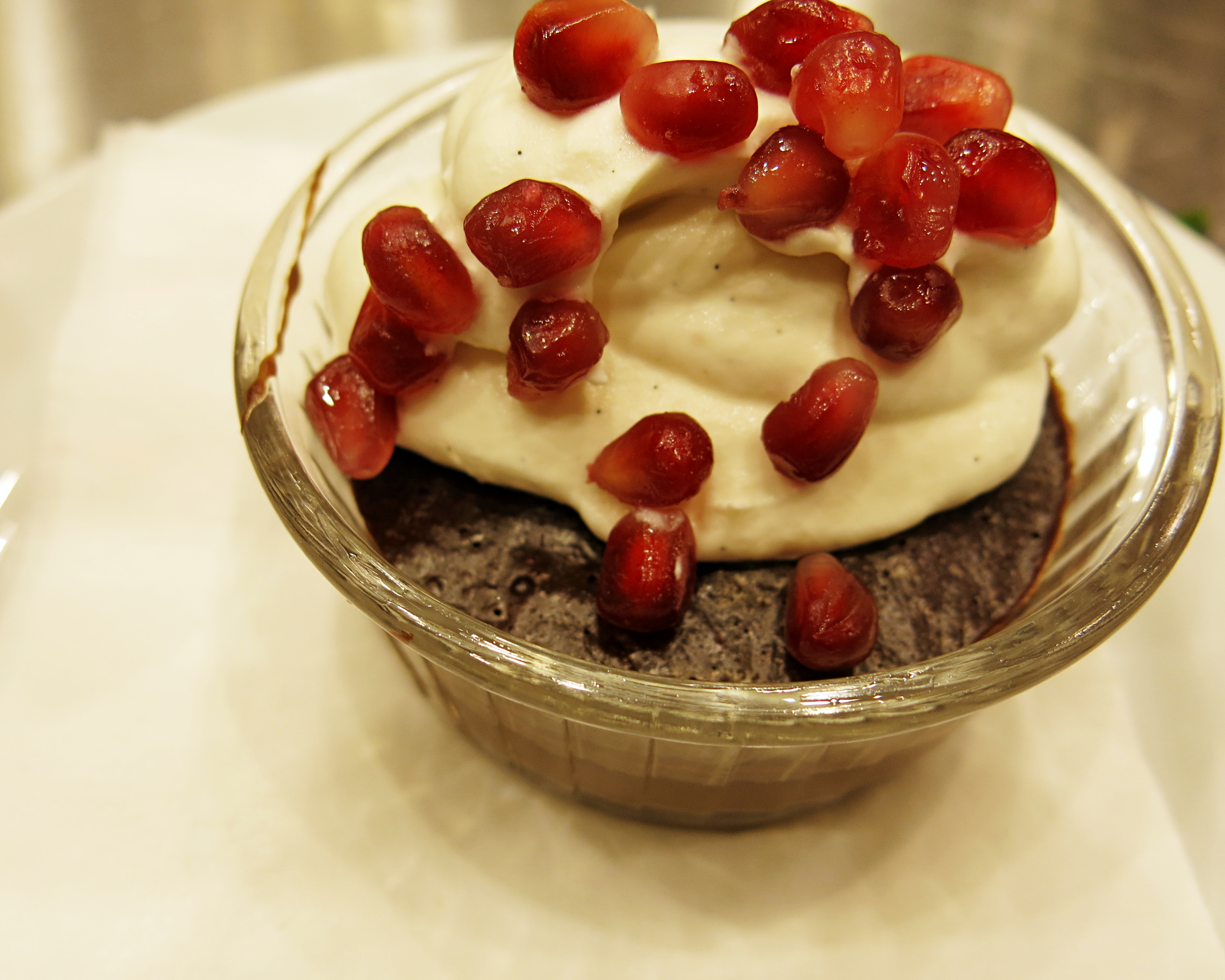 Dessert: Mast Brothers flourless chocolate cake, topped with creme + pomegranate seeds