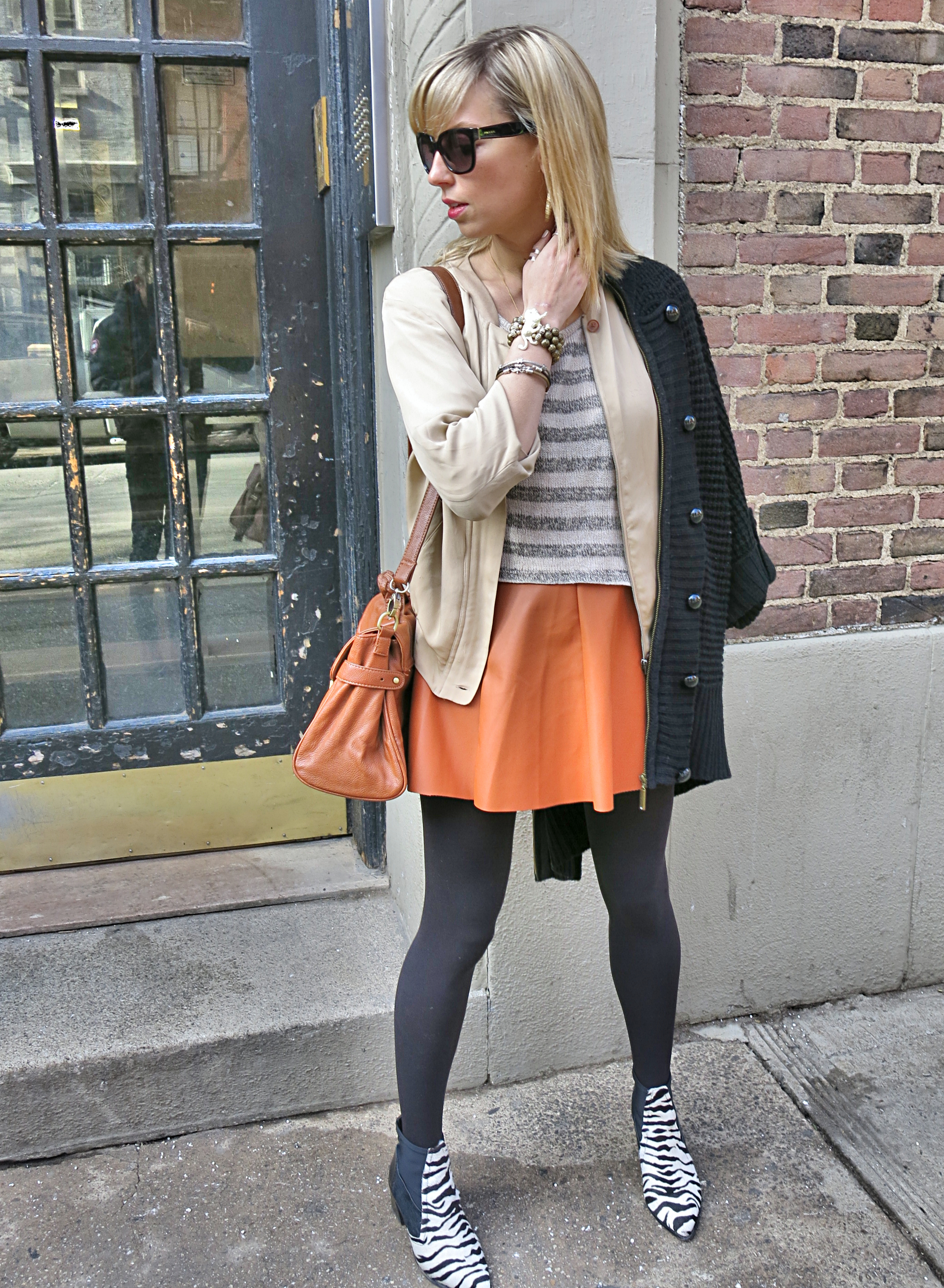 As much as I love experimenting with fashion, most mornings I reach for one of two trusted uniforms. The first consists of a crisp button-down, skinny pants, and a blazer (fun fact: this is also my boyfriend’s uniform of choice, making getting dressed in the morning a daily “who wore it better?” that occurs entirely inside my brain. Spoiler alert, he did, always). The second uniform is the look you see below: loose sweater, A-line skirt, and a blazer/jacket. Since I’m fairly certain it will never be warm again (my future genetically-engineered children will look at photographs/holograms of bare legs and bikinis and mock mom for her bizarre fashions using the sole remaining method of communication: Snapchats with penis drawings on them), I’ve been adding a permanent cocoon coat to my uniform of choice.